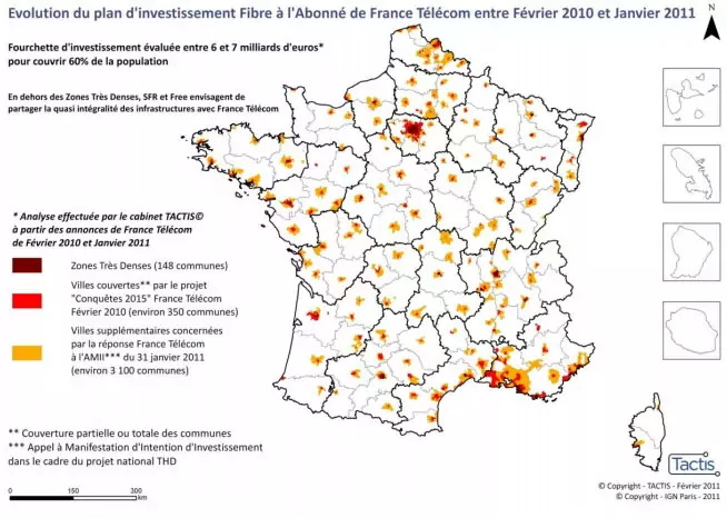 Tactis indique que France Télécom affiche une intention plus ambitieuse qu’en 2010. Alors que 12 mois auparavant, Stéphane Richard (DG FT ORANGE) avait fixé dans le cadre du programme « Conquêtes 2015 » l’ambition de couvrir de l’ordre de 500 communes (40% de la population métropolitaine). Ce passage de 500 à 3600 communes est un changement de dimension dans l’ambition de l’opérateur historique français.