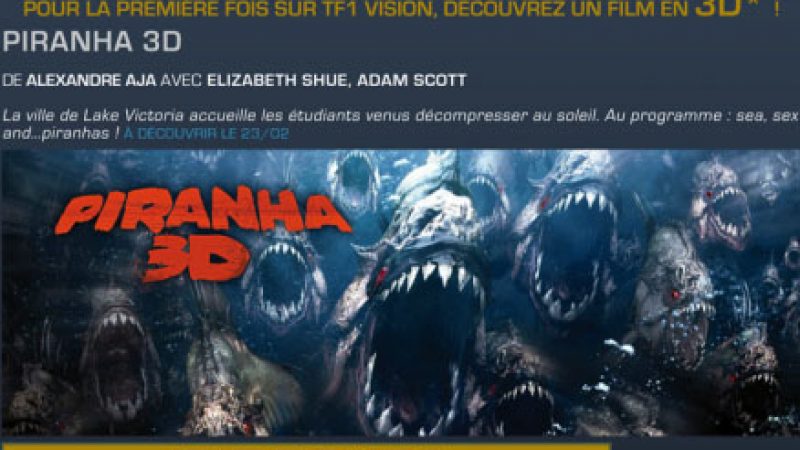 Après Cinéma(s) à la demande 3D (canal 110 de Freebox TV) qui offre un choix de 5 films en 3D, c’est au tour de TF1 Vision de proposer des programmes en 3 dimensions. Le service de VOD de TF1 (disponible dans le vidéo club de la Freebox) proposera dès ce mois ci le film Piranha 3D, au tarif de 7,99 euros (et 4,99€ pour la version 2D).