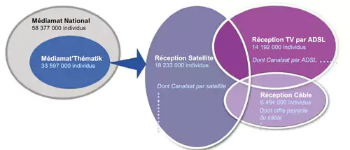 Médiamétrie vient de publier Médiamat’Thématik qui couvre la période du 30 août 2010 au 13 février 2011. Il s’agit de la mesure audimétrique de l’audience de la télévision auprès des personnes recevant une offre de chaînes via le câble, le satellite ou la télévision par ADSL soit 58% de la population résidant en France équipée TV.