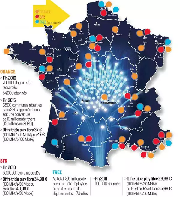 Fibre : La carte prévisionnelle de déploiement pour 2011 de Free, Orange et SFR