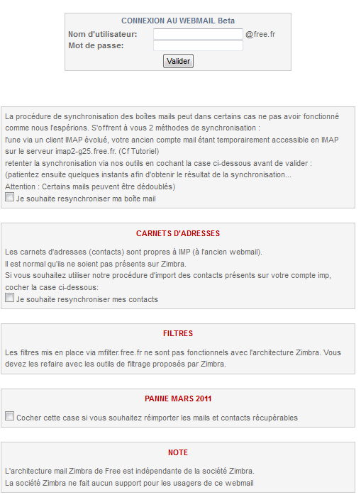 Sur la page zimbra.free.fr, les freenautes ont la possibilité de réimporter les mails et contacts récupérables. Pour se faire, il suffit de se connecter sur cette même page et de cocher la case appropriée.