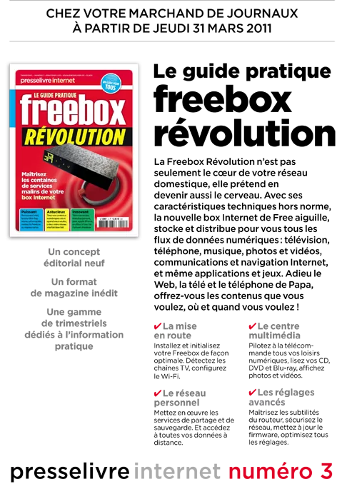 Ce mois ci, dans vos kiosques, le numéro 3 de Presselivre Internet consacre 160 pages à la Freebox Révolution. Presselivre Internet propose une exploration méthodique et exhaustive de la plupart des possibilités offertes par la box ADSL de Free.