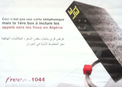 Seul opérateur a inclure les appels vers l’Algérie dans son forfait, Free a lancé une campagne promotionnelle sur ce nouveau service d’appels à l’étranger. Sur les panneaux publicitaires du métro parisien, un nouveau slogan illustre la nouvelle Freebox Révolution :