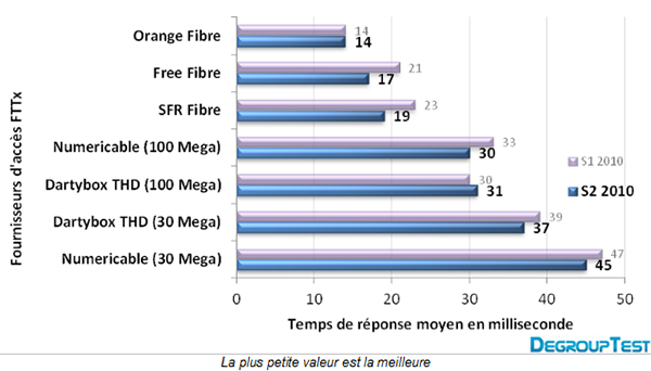 En ce qui concerne le baromètre des accès résidentiels FTTx en France métropolitaine, Free et SFR se placent en tête en ce qui concerne les débits descendants avec des moyennes respectives de 52,60 Mb/s et 46,50 Mb/s. Orange est assez proche avec une moyenne de 46,08 Mb/s.