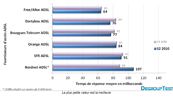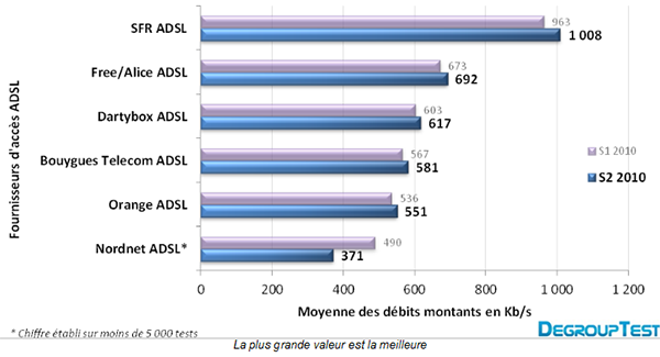 DegroupTest publie son deuxième baromètre des connexions, qui concerne cette fois-ci le 2ème semestre 2010. Les résultats sont tirés de l’ensemble des tests de débits effectués sur le site DegroupTest, soit 3 568 524 tests. Avec l’identification de l’adresse IP, le site a pu répartir les données en fonction des réseaux des opérateurs et calculer les moyennes pour chaque opérateur fixe et mobile. DegroupTest indique que ces chiffres sont des moyennes et non des maximums. Ils ne reflètent pas les possibilités maximum des connexions mais uniquement une tendance générale moyenne, dépendante de la situation géographique des utilisateurs et de la configuration matérielle et logicielle des ordinateurs utilisés pour faire les tests de débit. Dans cette deuxième édition, Free affiche encore les meilleures performances dans 4 mesures sur 6, et arrive 2ème dans les deux autres cas.