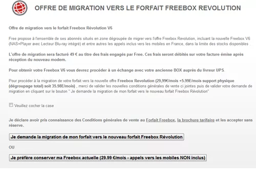 Puisque votre forfait est toujours facturé à 35,98€ par mois, Free vous propose d’accepter ou non la Freebox V6 pour 49€. Dans le cas où vous ne désirez pas obtenir la nouvelle box, il suffit de cliquer sur « Je préfère conserver ma Freebox actuelle (29,99€/mois – appels vers les mobiles non inclus).