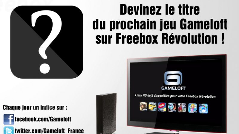 Gameloft annonce la mise en place d’un nouveau jeu sur la Freebox Révolution tout en laissant planer le mystère. La société a décidé d’organiser un jeu concours et vous propose de deviner le titre du prochain jeu sur Freebox Révolution.