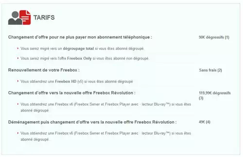 Pour ne plus payer d’abonnement téléphonique, c’est-à-dire de passer de l’offre IP ADSL vers l’offre Freebox Only en zone non dégroupée ou pour passer au dégroupage total, la facture est de 90€. Les frais facturés sont dégressifs en fonction du délai écoulé depuis la dernière opération que vous avez sollicitée sur votre accès (Les frais sont de : 90€ -3€ par mois d’ancienneté calculée selon ce délai).