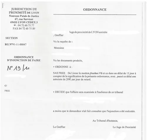 Furieux de ne pouvoir profiter de la Freebox Révolution, le lyonnais a saisi le tribunal de proximité début mars et a obtenu gain de cause le 28. Même si sa Freebox a depuis été livrée, cela n’a pas eu lieu dans les 15 jours comme le stipulait la décision du tribunal. Free devrait donc payer l’astreinte de 20 euros par jour de retard, et éventuellement des dommages et intérêts. Free a indiqué qu’il ne souhaitait pas faire de commentaires suite à cette décision de justice.