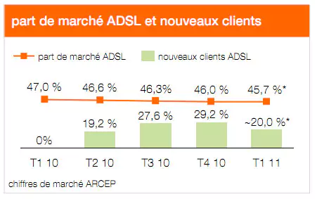 Alors qu’Orange avait amorcé une reprise de ses recrutements à la fin de l’année 2010, l’opérateur accuse une baisse de sa part de marché sur les recrutements au 1er trimestre 2010, qui tombe à 20%. Pour autant, en valeur absolue le nombre de nouveau abonnés est plutôt bon avec 89 000 clients supplémentaires.