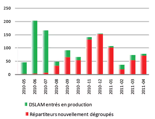 La Newsletter de l’ADUF vient de publier le bilan du dégroupage chez Free pour le mois d’avril. Avec 70 nouveaux NRA dégroupés sur le mois, l’opérateur reste dans sa moyenne annuelle, sans pour autant retrouver les scores du dernier trimestre 2010 (150 NRA avaient été dégroupés en décembre). A fin avril, ce sont donc 3486 répartiteurs ou sous répartiteurs qui sont reliés au réseau de Free.