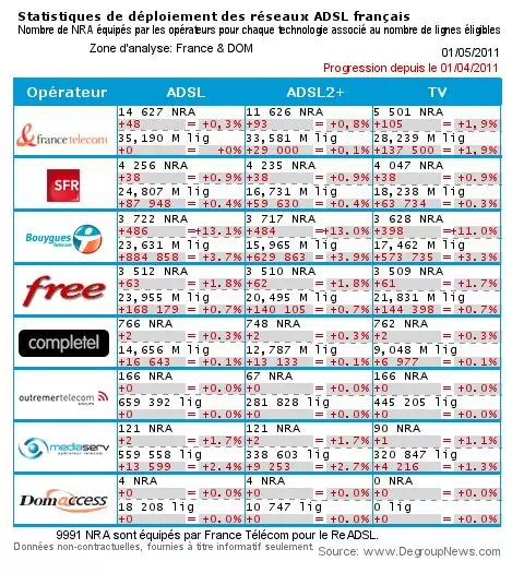 Dégroupnews vient de publier le bilan du déploiement ADSL du mois d’avril. Après quelques mois creux au niveau du dégroupage, Free s’est montré particulièrement actif puisqu’il a dégroupé 63 répartiteurs ADSL (62 pour l’ADSL2+ et 61 pour la TV).