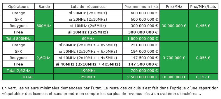 Au-delà du choix de telle ou telle bande de fréquences, l’ADUF estime que Free devra débourser la somme de 400 à 500 millions d’euros pour obtenir un minimum de fréquence. Une acquisition qui s’ajoute à l’accord passé avec Orange sur l’itinérance 2G élargi à la 3G. Un contrat qui va rapporter plus de 1 milliard d’euros sur cinq ans à l’opérateur historique – et quelques millions pour la première année.