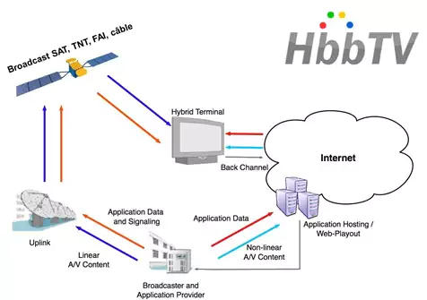 « Techniquement, HbbTV s’appuie sur la diffusion d’informations numériques dans le canal “broad-cast” (pour la TNT, le câble et le satellite, du moment que le standard de diffusion est une variante du DVB, DVB-T, DVB-C ou DVB-S) et via Internet. La chaine TV choisit la manière dont elle équilibre l’envoi d’informations via le broadcast et via le broadband (haut débit), sachant que dans le premier cas, il n’y aura pas d’interactivité. Dans les deux cas, les informations envoyées sont des URL et des contenus de type web (HTML 4 + JavaScript) » explique Olivier Ezratty sur son blog Opinions Libres.