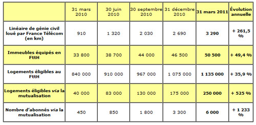 L’ARCEP son tableau de bord du très haut débit fixe au 31 mars 2011, permettant de suivre l’état de déploiement de la fibre sur le territoire, l’utilisation des offres de gros de génie civil de France Télécom et la mise en œuvre de la mutualisation des réseaux en fibre optique jusqu’aux abonnés par l’ensemble des opérateurs.
