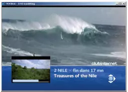 C’est l’une des exclusivités de la télévision numérique de Club Internet : elle permet d’afficher en « double direct » dans une lucarne d’autres chaînes que celle que vous regardez. Depuis le même bandeau, vous pouvez savoir depuis combien de temps a commencé le programme et faire défiler l’ensemble des programmes, pour connaître les émissions en cours ou qui vont suivre. La navigation de chaîne en chaîne n’a jamais été aussi fluide.