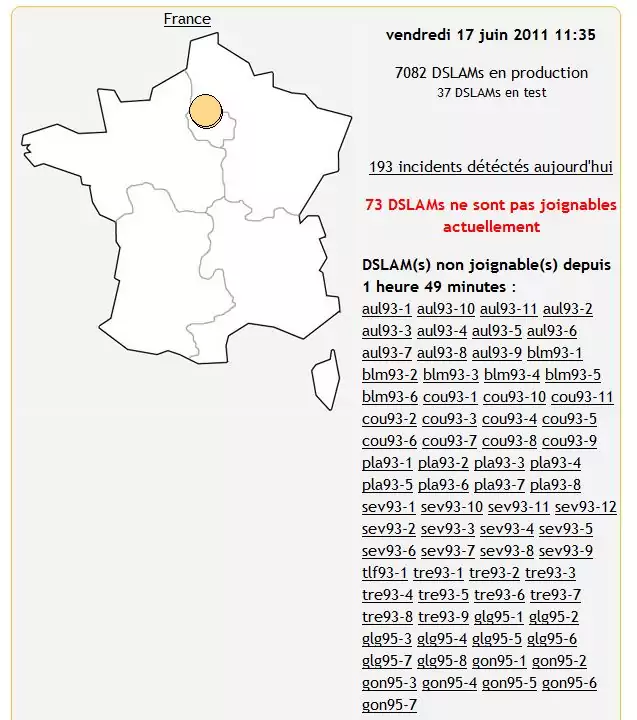 Selon free-reseau.fr et vos témoignages, un certain nombre de DSLAM sont victimes d’une panne impliquant la perte des services Internet, Téléphone et Télévision pour les abonnés raccordés aux DSLAM suivants :