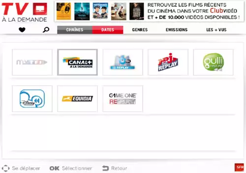 SFR propose seulement 8 chaînes en rattrapage à savoir : MyTF1, Canal + à la demande, M6 Replay, NRJ 12, Gulli, Disney, Equidia et Game One. Le service MyTF1 n’est pas encore actif et le replay de Canal + s’associe à un abonnement à la chaîne cryptée.