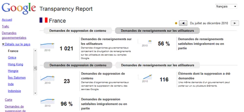 Entre juillet et décembre 2010, les différentes autorités françaises ont effectué 1021 demandes de renseignements sur les utilisateurs des services Google.