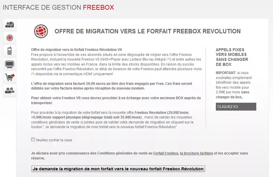 C’est donc en toute transparence que Free a ajouté, il y a quelques temps, un message d’information sur l’option forfait mobile dans sa page allouée à la procédure de migration : « Appels fixes vers mobiles sans changer de box : si vous souhaitez simplement bénéficier des appels fixe vers mobile pour 2,99€ par mois sans changer de box, cliquez ici ».