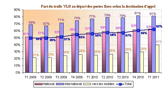 Les minutes IP représentent désormais 62% de l’ensemble des minutes émises au départ des postes fixes au premier trimestre 2011. Le trafic IP représente 81% de l’ensemble des minutes des communications internationales et 63% des minutes des communications nationales vers les postes fixes. La proportion de minutes émises en IP vers les mobiles bondit de 11 points (40% contre 29% au précédent trimestre).