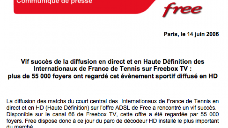 Vif succès de la diffusion en direct et en Haute Définition des Internationaux de France de Tennis sur Freebox TV :