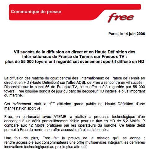 Vif succès de la diffusion en direct et en Haute Définition des Internationaux de France de Tennis sur Freebox TV :