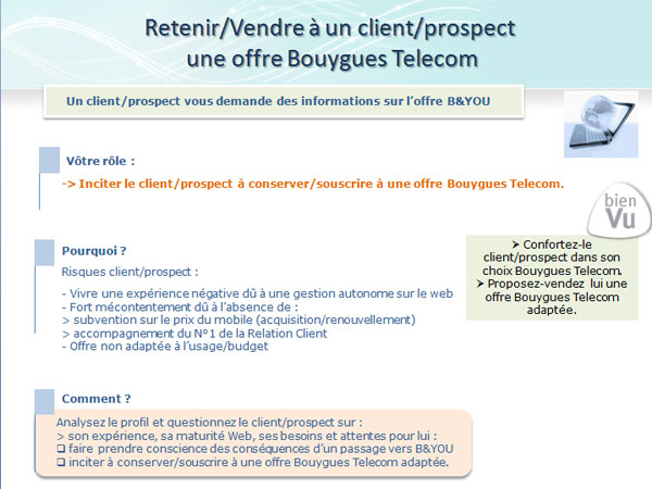 Et si avec ça le client souhaite toujours prendre un forfait B and You, les conseillers devront insister sur le fait qu’ils devront se débrouiller seuls en cas de problème, seul un forum communautaire, le mail, et une Foire aux questions seront disponibles. Et de préciser « B and You s’adresse uniquement aux utilisateur autonomes, habitués à aller chercher en ligne des solutions à leurs questions, à échanger sur des forums, capable de paramétrer leur Smartphone presque aussi rapidement qu’un professionnel, capables en un mot de maitriser et de s’approprier réellement les technologie qu’ils utilisent »