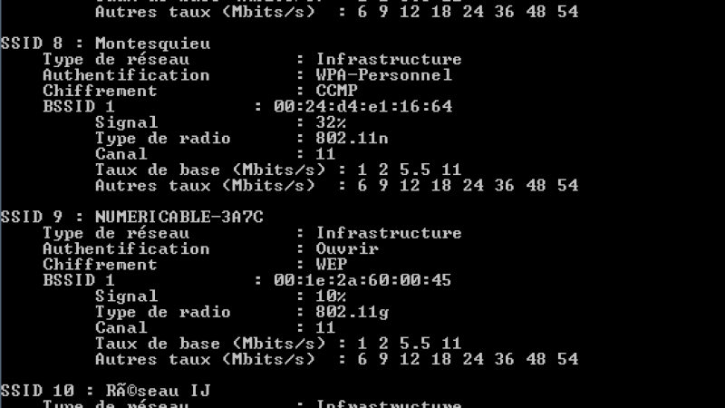 Pour identifiez les canaux utilisés, lancez l’invite de commande sur un ordinateur équipé d’une carte wifi et reportez cette commande : netsh wlan show networks mode=bssid