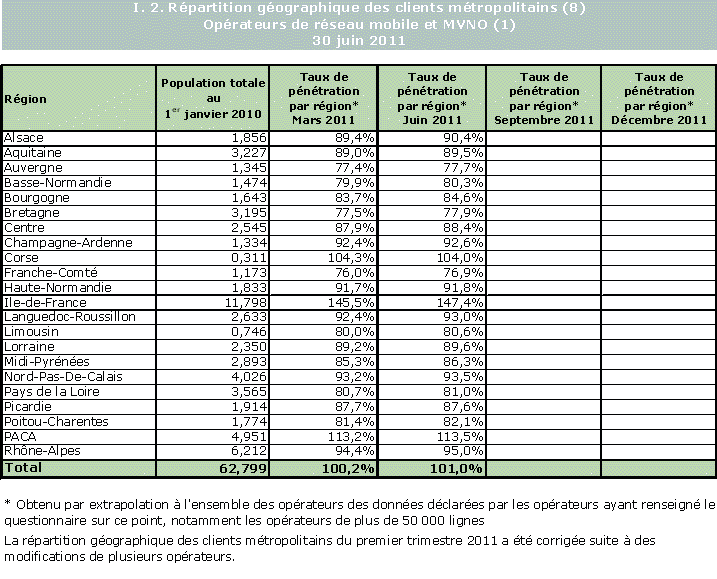 L’ARCEP vient de publier les chiffres du marché des communications électroniques (services mobiles) en France pour le 2ème trimestre 2011. Il en ressort qu’au 30 juin 2011, la France comptait 63,856 millions d’abonnés au mobile, soit un taux de pénétration de 101,6%. Ce taux est variable suivant les régions. Il est par exemple plus important en Ile de France (147,4%) qu’en Auvergne (77%).