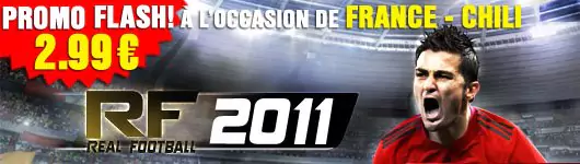 A l’occasion du match France-Chili qui se joue ce soir à 21h45, Gameloft propose une promo flash sur la Freebox Révolution. A partir de 18h00, le jeu Real Football 2011 HD sera DISPONIBLE à 2.99€ au lieu de 6.99€ dés 18h sur le Freestore ! (DUREE LIMITEE)