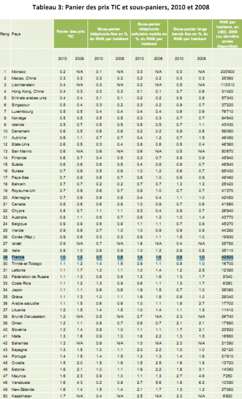 L’étude prend en compte la part de budget moyen consacré par habitant et révèle aussi la part allouée à chaque service : la téléphonie fixe, la téléphonie mobile et l’accès à Internet. A la 29ème place, le mauvais classement français tient du prix de la téléphonie mobile même si la France propose l’une des offre internet la moins chère.