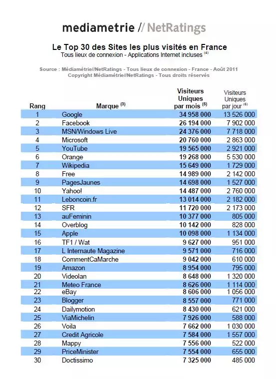 Médiamétrie vient de publier le classement des sites le plus visités au mois d’août. Free.fr occupe la 8ème place, derrière Google, Facebook, MSN, Microsoft, Youtube, Wikipedia et Orange. Avec 14 989 000 visiteurs uniques sur le mois, free.fr est en diminution par rapport aux chiffres de l’année précédente. Tout comme Free, Orange perd des visiteurs uniques alors que Facebook a presque doublé son audience en douze mois.