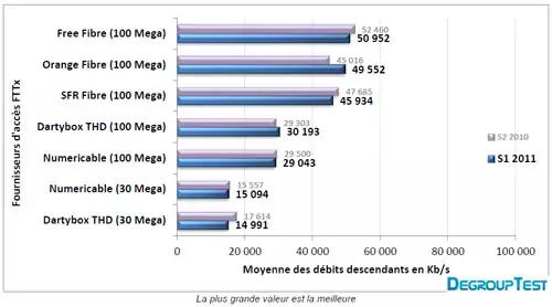 Dartybox et Numericable, offrent des débits respectifs de 30,19 Mb/s et de 29,04 Mb/s pour leurs offres à 100 Mega. Le cas de ces deux