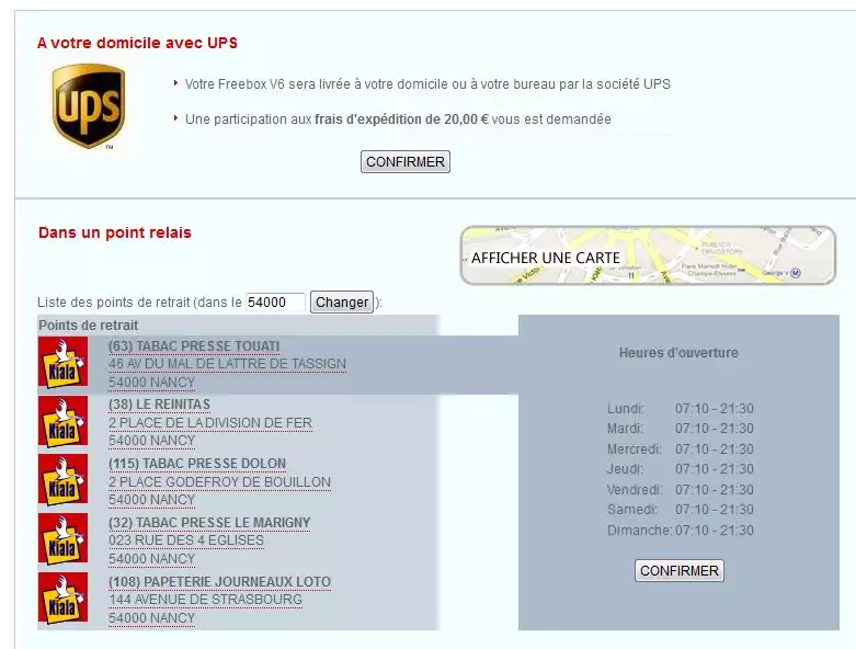 Jusqu’à présent, les freenautes pouvaient sélectionner un relais kiala ou le dépot UPS gratuitement. Il est également possible de demander la livraison au domicile pour 20€.