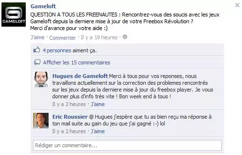 Sur son compte Facebook, Gameloft, qui propose un catalogue de 11 jeux sur le freestore de la Freebox Révolution, souhaite savoir si les freenautes rencontrent des soucis avec les jeux depuis le déploiement du dernier firmware (1.1.0).