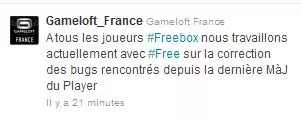 Via son compte Twitter, Gameloft annonce travailler actuellement avec Free pour résoudre cette problématique. De son côté, Free annonce que le bug est en cours de résolution sur le bugtracker (FS#3763).