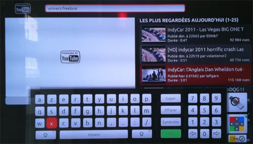 Pour recherchez vos vidéos, utilisez le clavier virtuel en utilisant les flèches ou la fonction gyroscopique. A noter qu’il est également possible d’utiliser un clavier usb ou les télécommandes virtuelles pour smartphones.En appuyant sur la touche OK de votre télécommande, vous pouvez désormais visualiser les vidéos en plein écran.