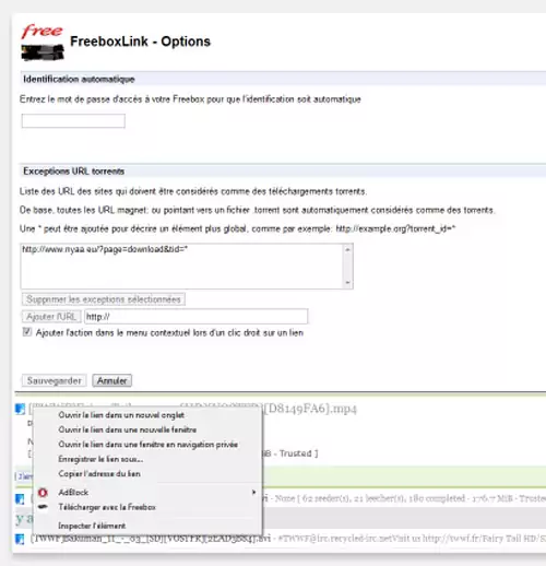 FreeboxLink est une nouvelle extension pour Chrome permettant de simplifier l’utilisation de la SeedBox. Cette extension distingue, dans la plupart des cas, les fichiers torrents des fichiers normaux, mais intègre la possibilité d’ajouter des URL à prendre en compte pour les fichiers torrents, qui ne contiennent pas l’extension ".torrent" à la fin de l’URL. Un élément dans le menu contextuel (via le clic droit), peut être aussi ajouté dans les options, pour renseigner automatiquement le lien.
