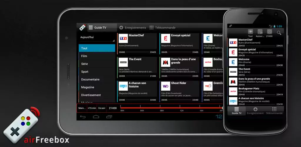 Cette application fonctionne avec Android et sur les systèmes d’exploitation Windows, Mac et Linux. Il s’agit d’une télécommande wifi avec des fonctions avancées, elle vous permet de contrôler votre boitier, propose un guide TV sur 7 jours, gère les chaînes favorites, résume les programmes et permet la programmation des enregistrements.
