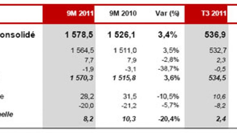 Sur les neufs premiers mois de l’année, le chiffre d’affaires du groupe s’établit à 1 578,5 millions d’euros, en hausse de 3,4% par rapport aux neufs premiers mois de 2010.