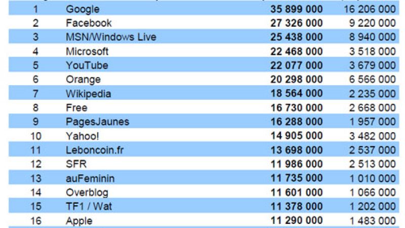 Médiamétrie vient de publier sa mesure d’’audience de l’Internet en France pour le mois d’octobre 2011. Le classement de tête reste identique au mois précédent avec Google largement devant suivi de Facebook et MSN/Windows Live. Le domaine Free.fr conserve sa 8ème place. Son audience est de 16 730 000 visiteurs uniques par mois.