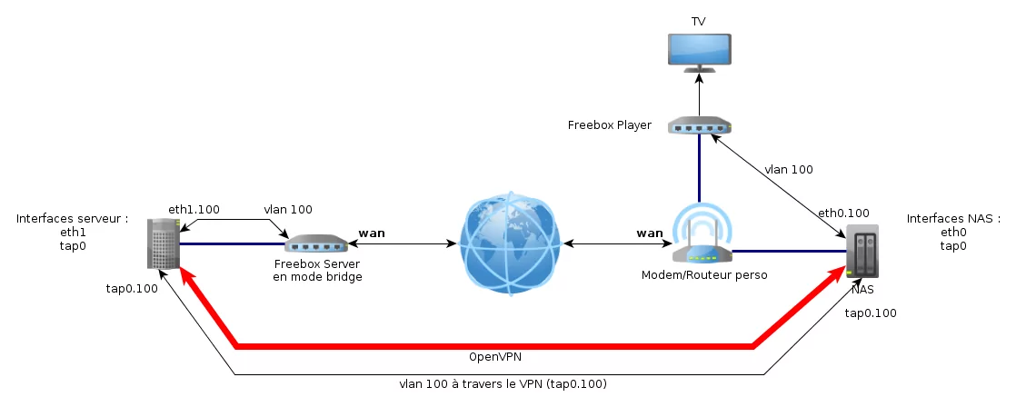 Pour fonctionner, ne serait-ce que pour démarrer, la Freebox Player doit être reliée à la Freebox Server en local. Il existe pourtant une solution pour les faire communiquer par VPN. Un Freenaute, qui n’utilisait pas le Player de son entreprise a souhaité pouvoir l’utiliser à son domicile. « Mon idée était donc de faire communiquer le FP avec le FS par l’intermédiaire d’un VPN. La clé de voute est que le FP communique avec le FS à travers un VLAN tagué (id 100). Pour résumer, le FP dispose de 2 réseaux distincts sur le même port Ethernet (eth0 pour le réseau LAN et eth0.100 (virtuel d’id 100) pour la synchronisation avec le FS, en admettant que eth0 représente l’interface du FP). » explique-t-il.