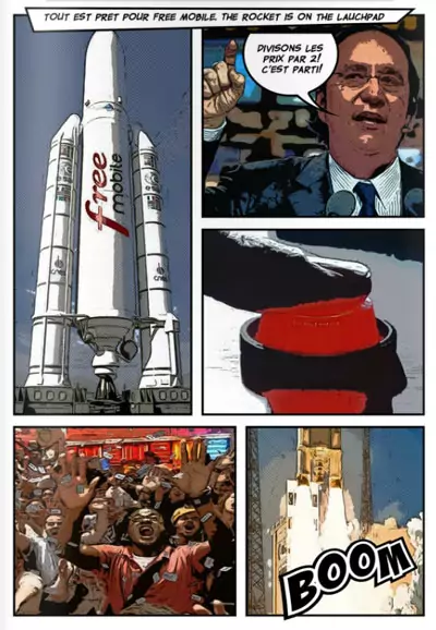 Le lancement de Free Mobile a été imagé par Xavier Niel en lancement de fusée (ou missile). Pou illustrer ce décollage, freemobileactu.com a réalisé un joli clin d’œil sous la forme d’une petite bande dessinée où la foule en liesse assiste au lancement de la fusée Free Mobile et au largage des cartes SIM.
