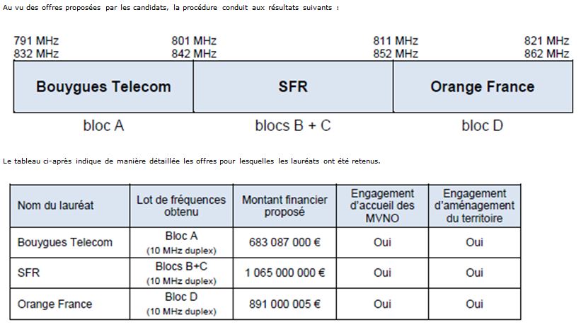 L’ARCEP publie ce jour sa décision relative au compte rendu et aux résultats de la procédure d’attribution des fréquences dans la bande 800 MHz. Ces fréquences sont destinées au déploiement des nouveaux réseaux (4G) qui donneront notamment accès à l’internet mobile à très haut débit. Ils permettront de fournir aux utilisateurs des débits très supérieurs à ceux actuellement disponibles sur les réseaux 3G, puisque le débit maximum sera au moins de 60 Mbit/s.