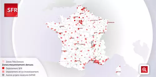 SFR a mis à disposition du public une carte interactive permettant découvrir toutes les villes concernées, qu’elles soient en zones denses (où il existe des accords de mutualisation), ou moins denses, et donc déployées dans le cadre du co-investissement.