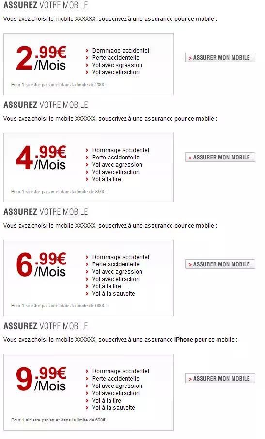 Une autre page du site Free Mobile a été découverte. Celle-ci permet de connaitre les assurances pour les terminaux que Free Mobile devrait propose. Cette gamme s’étale de 2,99 euros par mois à 9,99 euros par mois pour un iPhone. Suivant la formule choisie, les risques couverts sont : les dommages accidentel, la perte accidentelle, le vol avec agression, le vol avec effraction, le vol à la tire et le vol à la sauvette.