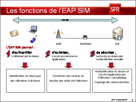 Le protocole EAP-SIM avait été testé par SFR et Alcatel en 2007, il permet d’authentifier un utilisateur sur le réseau WiFi, et WPA-TKIP pour crypter la connexion WiFi [source persive-network]. Le très gros avantage pour les abonnés Free Mobile, et que tout cela se fait de façon transparente, dès qu’ils se trouvent à proximité d’un réseau free Wifi. La connexion à l’Internet Mobile n’utilise ainsi plus la 3G mais le Wifi et elle n’est donc plus décomptée des 3Go de fair use.