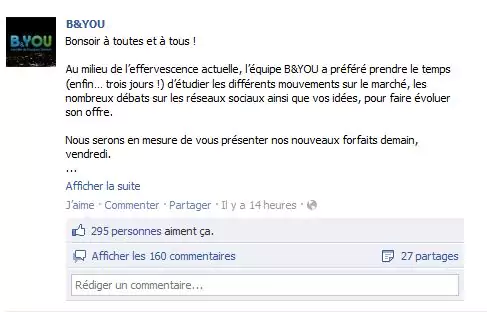 Bouygues Télécom dévoilera dans la journée ses nouvelles offres. Pour justifier son retard "l’équipe B&YOU a préféré prendre le temps (enfin… trois jours !) d’étudier les différents mouvements sur le marché, les nombreux débats sur les réseaux sociaux (…), pour faire évoluer son offre".