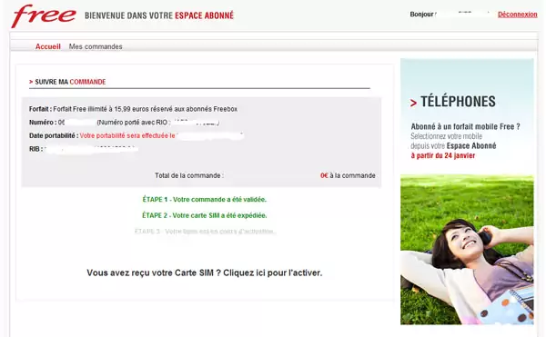L’espace abonné Free Mobile a une nouvelle fois changé. Il accueil désormais un nouvel onglet « mes commandes ». Pour le moment, cela amène sur la même page, mais on peut imaginer, d’après le nom, qu’il sera possible de suivre ses commandes de terminaux (disponibles à partir du 24 janvier) et/ou également la commande de plusieurs abonnements sur le même compte (multilignes)